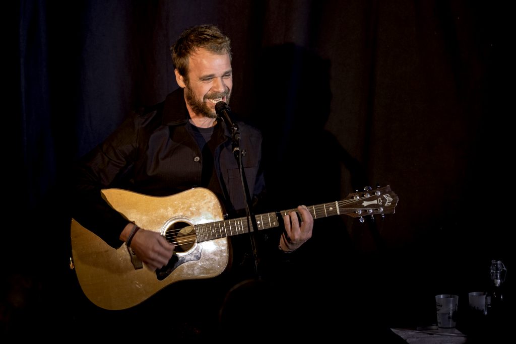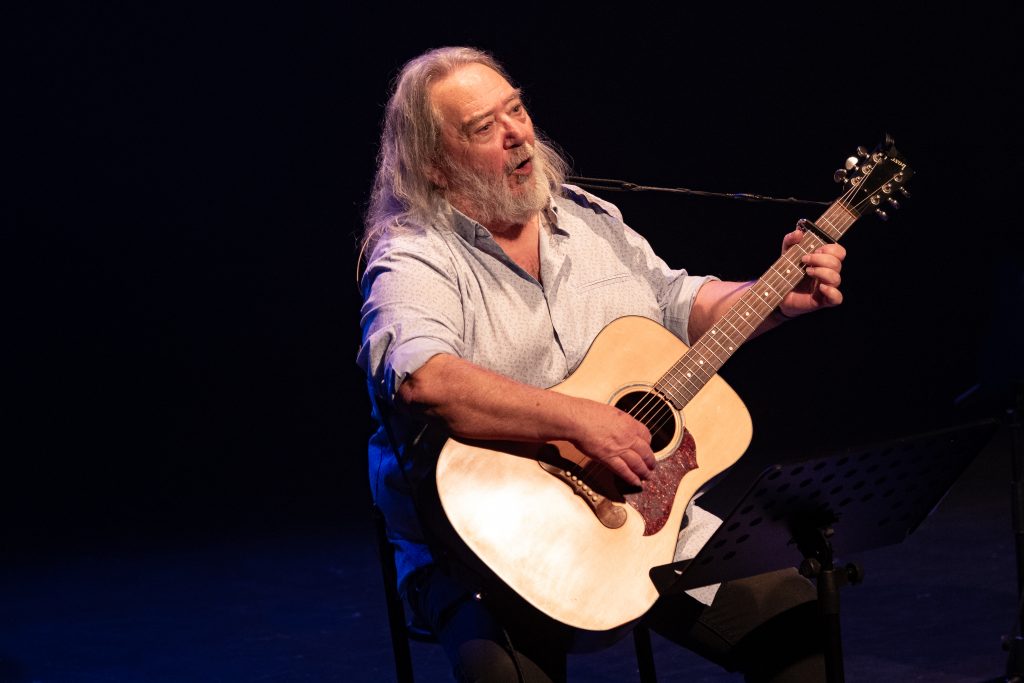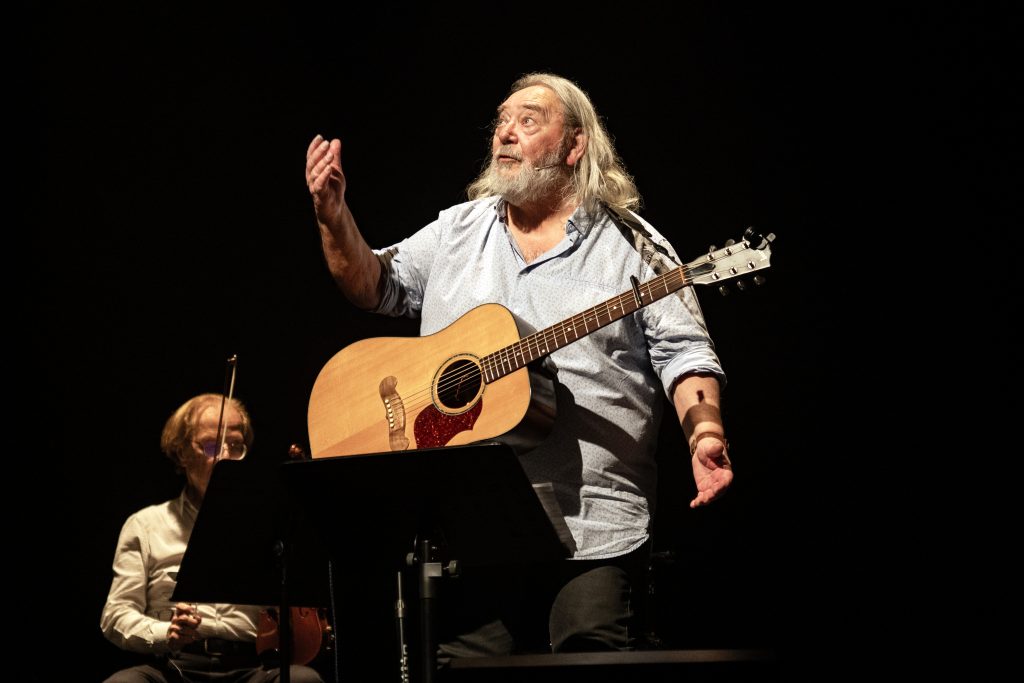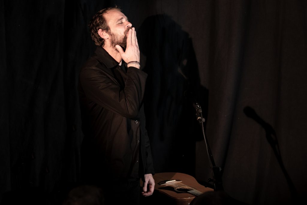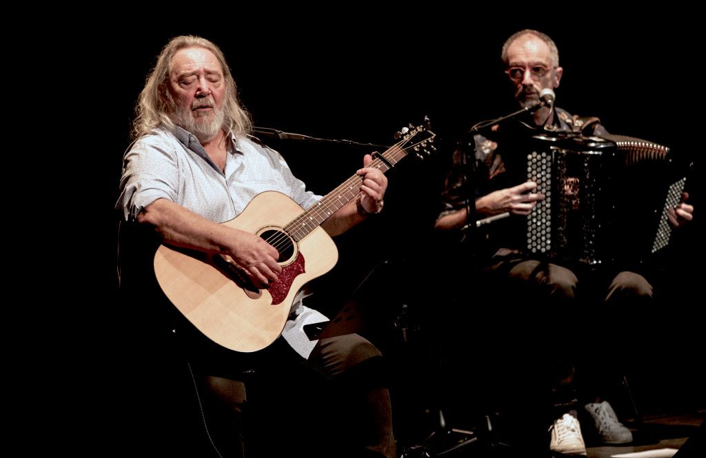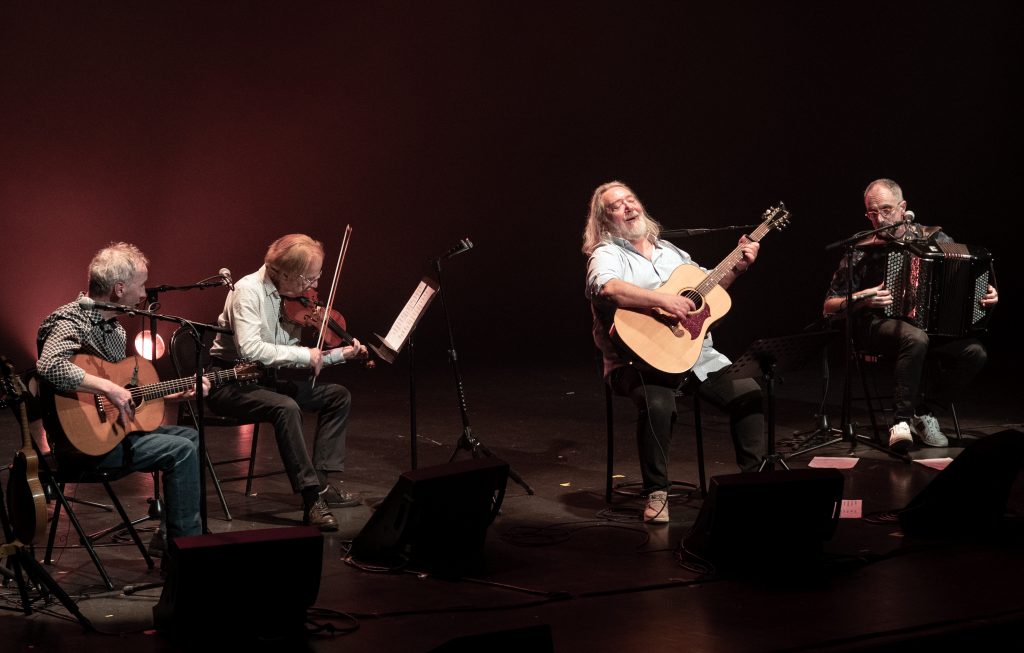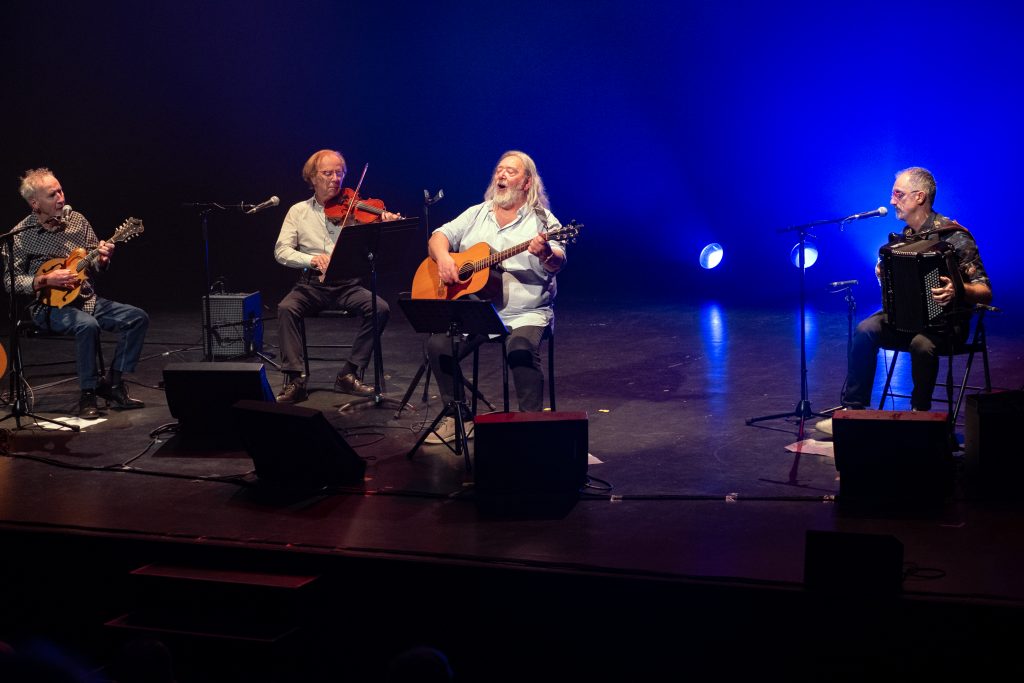 A côté du « Mariage insolite de Marie la Bretonne » ou de « L’Homme de Lune », que l’on avait déjà pu (re-)découvrir, en 2022, dans le superbe spectacle mené « Ensemble et réciproquement » par le même Jean-Michel Piton et son complice Michel Boutet, les Oumpapas (du titre d’une autre chanson de Luc Romann) nous ont offert un paquet de merveilles dopées par la guitare et la mandoline de Paul Delhumeau, le violon de Jean-Louis Duchesne et l’accordéon de Jules Moreau, avec par-dessus tout ça la putain de tonnerre de Zeus de voix de Jean-Michel Piton, une cathédrale de voix que j’ai entendue tant de fois et à laquelle je ne m’habitue toujours pas. Au bout d’une heure et demie que personne n’a vue passer, chacun a redescendu le petit escalier avec un sourire de là à là, un peu décoiffé (c’est l’ennui avec Jean-Michel Piton) mais radieux, « le ciel dans la tête, la terre dans le cœur ».
